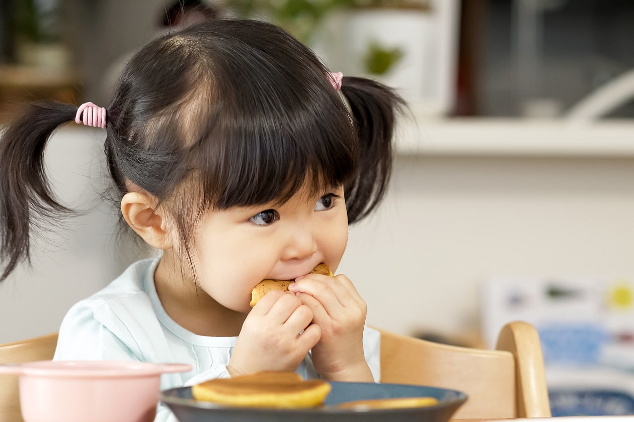 たとえば、厚生労働省「日本人の食事摂取基準(2020年版)」によると、1〜2才頃の推定エネルギー必要量は1日あたり約950kcal、3〜5才頃では1300〜1400kcalとされています。これを3回の食事だけでまかなおうとすると、1回の食事量が多くなりすぎてしまうことも。そこで、おやつで不足分を補うことにより、子どもにとって無理のない形で栄養を確保できるのです。