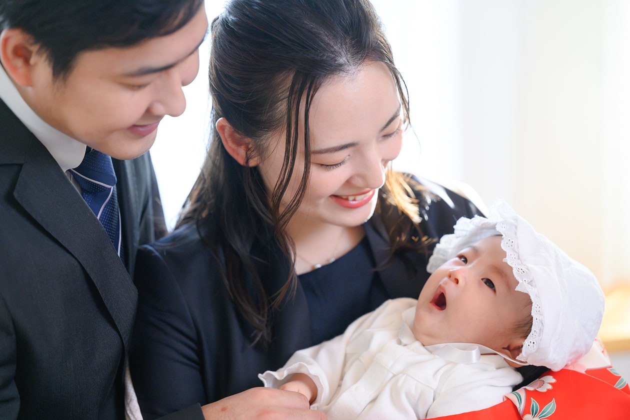 お宮参りでは、赤ちゃんの健やかな成長を神様にお祈りします。祝い着を着せてもらった姿は、ご家族にとってかけがえのない記念になるでしょう。