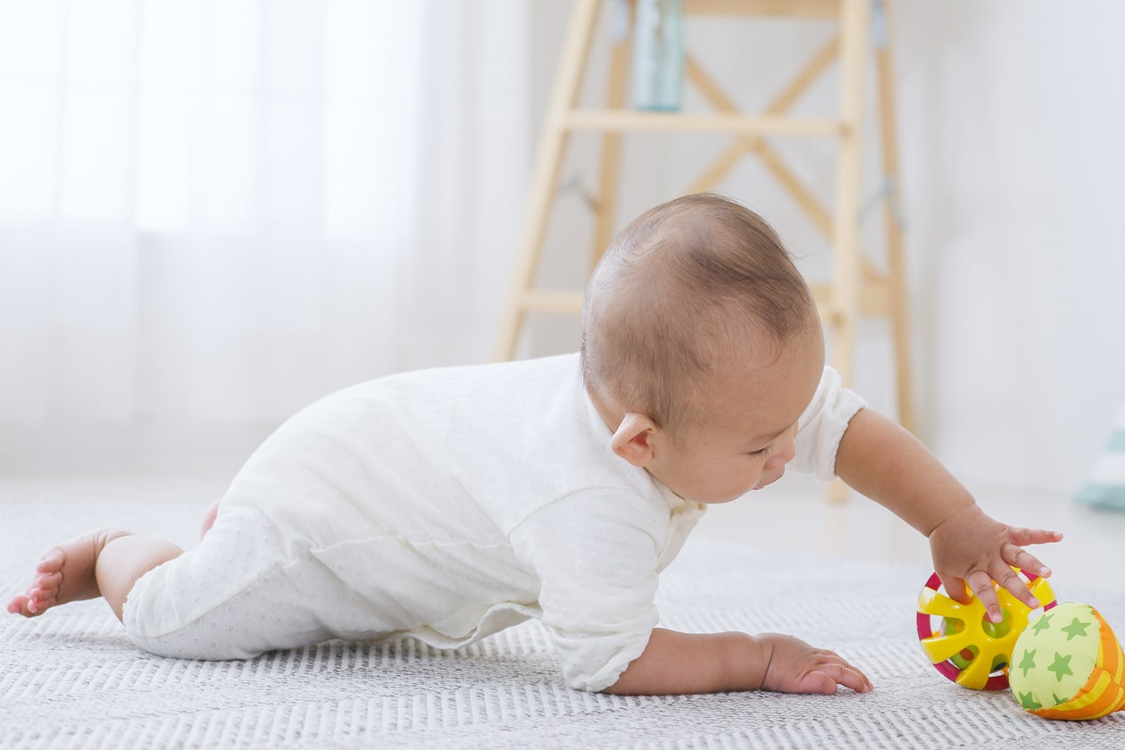 前述のとおり、この時期は床での自由な移動遊び(寝返り・ずりばい・ハイハイなど)を十分に経験できる環境づくりが有益です。