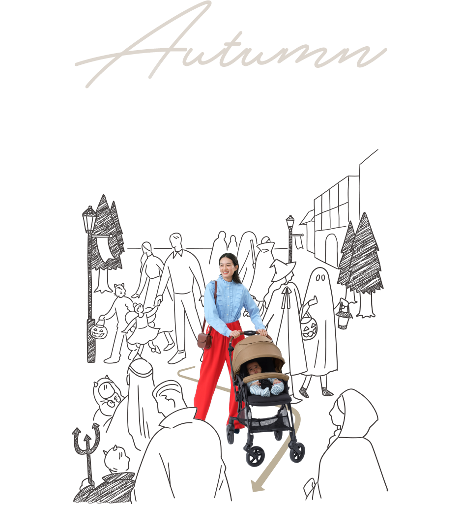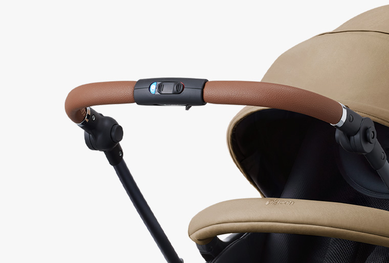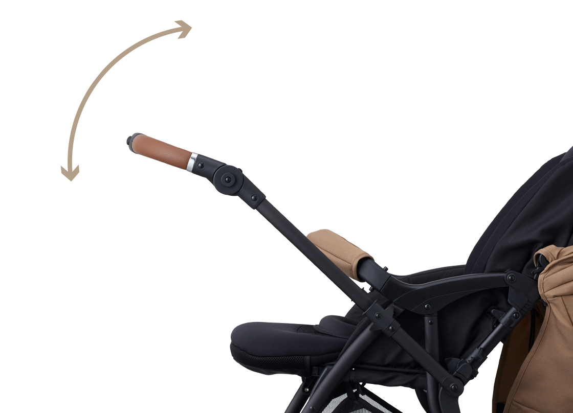 ママやパパの身長に合わせて、押しやすいベストな高さにハンドルを調節可能。車や玄関に収納する際は、ハンドルを収納ポジションに調節するとさらにコンパクトに。 -