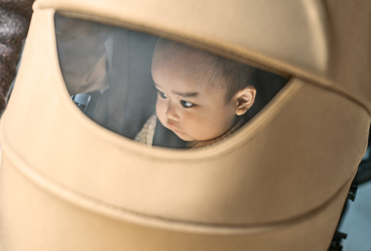 シートが側面まで包み込むから赤ちゃんの手がベビーカーの外に出にくく安心。